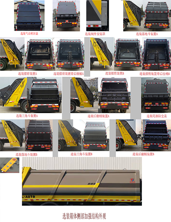 | 整車備注: | ABS系統控制器生產企業/型號為威伯科(上海)管理有限公司/4460046300;安裝有具有衛星定位功能的行駛記錄儀, 發動機/油耗值(L/100km)對應關系; MC07.31-60/37.18,MC07.34-60/37.18,MC07.33-60/37.18,WP8.350E61/37.1,MC07H.29-60/36.49,MC07H.33-60/36.49,MC07H.35-60/36.49,WP7.300E61/37.1;側后防護情況:側防護材料采用Q235B,連接方式螺栓連接,后下部防護由專用裝置代替,離地高度460mm;選裝直接供電ETC車載裝置,選裝限速裝置,選裝電控開關樣式,限速89km/h;僅選用1800+3800+1350軸距改裝,隨底盤選裝駕駛室,選裝箱體加強結構外觀,選裝閥件安裝罩,選裝尾部翻桶裝置,選裝尾部三角斗裝置,選裝尾部落地斗裝置,選裝尾部擺臂裝置,選裝底盤附件布置位置,選裝尾部裝置時后伸尺寸分別為:395mm,360mm,200mm,120mm;該車主要專用裝置由箱體、壓縮系統組成,用于垃圾的收集與清運,用于城鄉生活垃圾轉運.外形尺寸/軸距/前懸/后懸/后伸對應關系(mm):11090/1800+3800+1350/1450/2490/200,11250/1800+3800+1350/1450/2490/360,11010/1800+3800+1350/1450/2490/120,11285/1800+3800+1350/1450/2490/395,11250/1800+3800+1350/1450/2650/200,11410/1800+3800+1350/1450/2650/360,11170/1800+3800+1350/1450/2650/120,11445/1800+3800+1350/1450/2650/395. | ||
