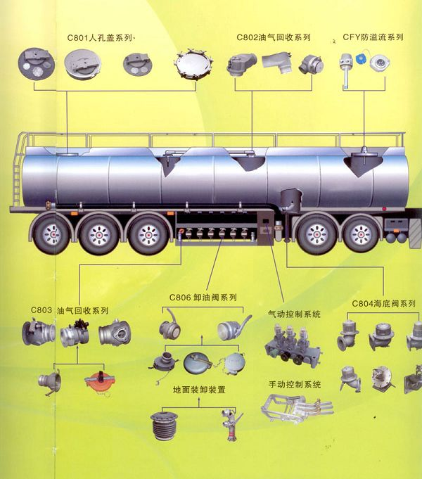 上圖為罐體分倉油罐車,油罐車罐體分倉的好處主要為不同油質的同時運輸帶來方便,每一個倉都需要一鋁合金罐口(也稱為人孔),可以帶防溢漏探頭,海底閥,卸油接頭(下裝油閥),油汽回收閥,海底閥,又稱緊急切斷閥,安裝于罐體底部,進行下裝加油時使用,操作簡便、節時、安全環保。