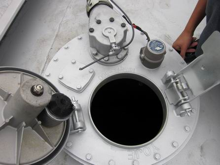 上圖是鋁合金歐標罐口,又稱人孔蓋,安裝于油罐頂部,具有內置呼吸閥和緊急排氣功能,并可在人孔蓋上安裝油氣回收閥、量油孔、防溢流探桿等,防溢流傳感系統在裝油的過程中,當液面到達探測位置時,傳感系統將自動報警,從而停止裝油。內置呼吸閥使油罐在運油過程中內部壓力保持穩定,與外部壓力達到平衡,其傾倒防止溢流的設計使油罐車在發生意外的情況下保持密封,緊急排氣裝置在罐內壓力急劇升高的情況下,將自動打開,釋放罐內壓力,大大提高油罐車運油時的安全性,從而防止事故的發生。